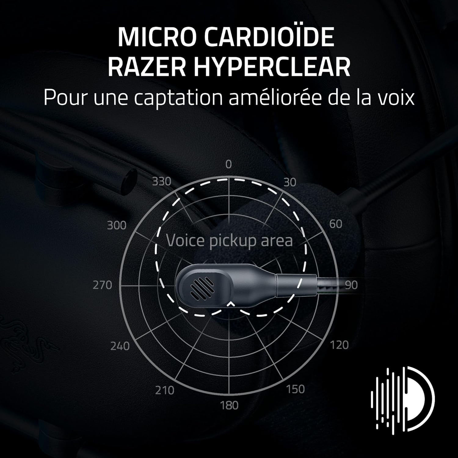 • Micro cardioïde Razer HyperClear - pour une meilleure capture de la voix : Un modèle de prise de son amélioré garantit plus de voix et moins de bruit en s'amenuisant vers l'arrière et les côtés du micro, le point d'écoute étant facilement placé au niveau de votre bouche grâce à la conception flexible du micro.